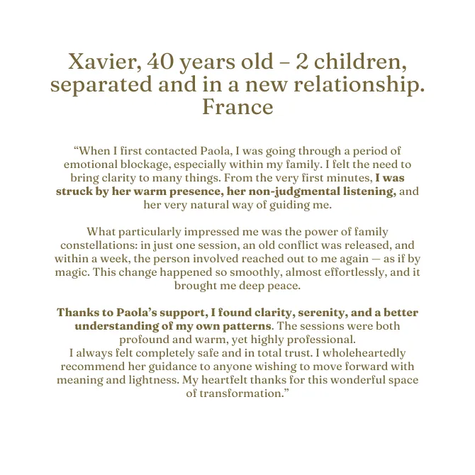 Thanks to my somatic background (Somatic Experiencing®, NARM, Core Energetics), I guide this process with deep respect for the nervous system, ensuring that no one feels overwhelmed, disoriented, or left alone after touching profound inner material.