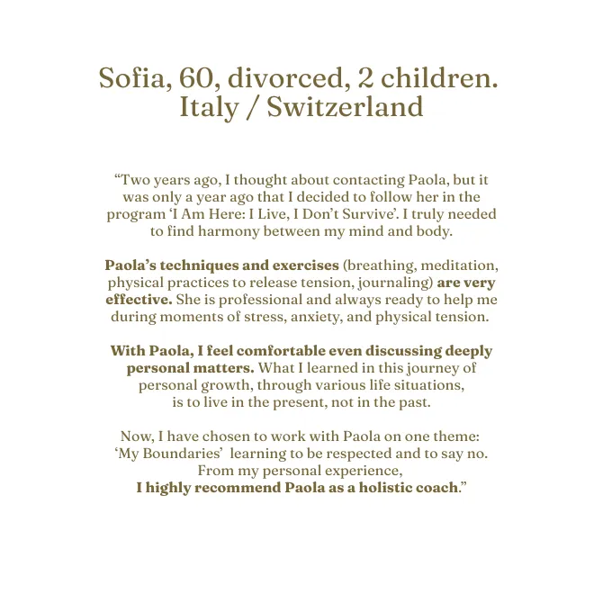 I come from a demanding professional world, defined by high standards, performance, and responsibility.I know well what it means to hold everything together — work, family, relationships — while feeling empty inside.