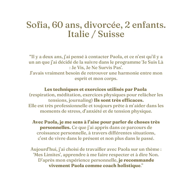 Ce travail s’inscrit pleinement dans mon approche et mon parcours central, « JE VIS — je ne fais pas que survivre », un chemin dédié à la présence incarnée, au choix conscient et à une vie plus authentique.